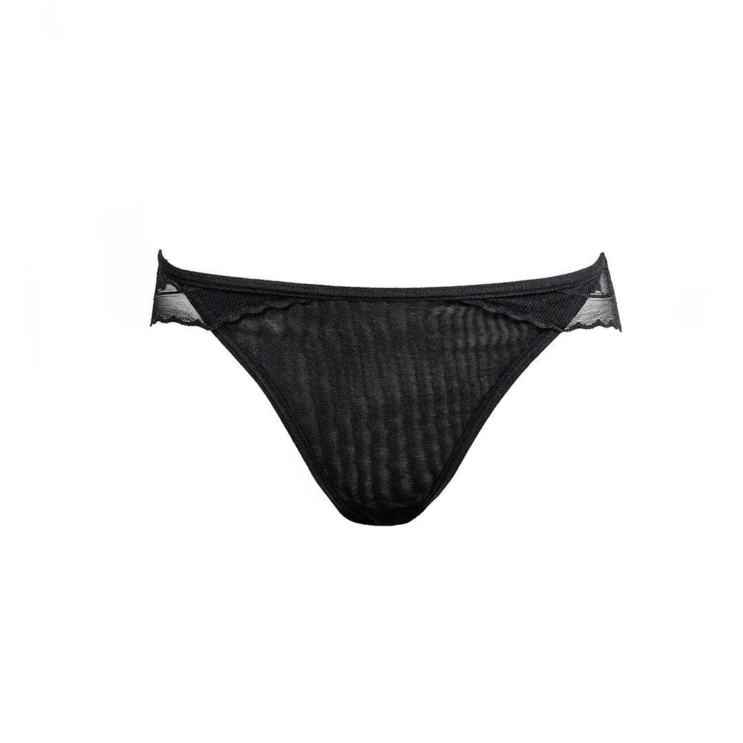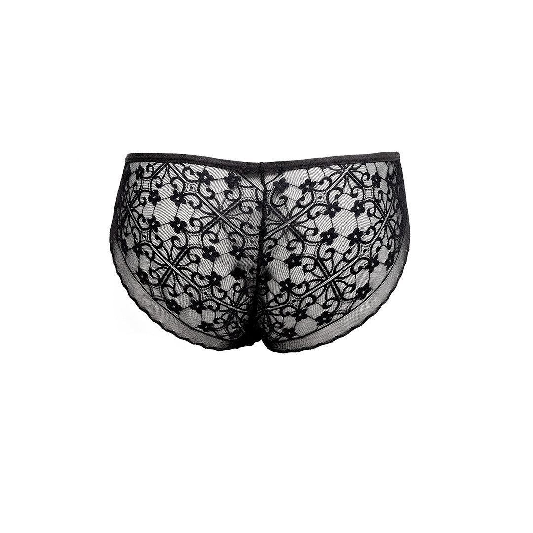 Calcinha biquini com a frente dupla em tule liso e traseira em renda com desenhos aplicados em base de tule. Acabamento da renda na parte traseira como extensão da propria renda, sem emenda ou costura. Detalhe que traz delicadeza e refinamento para a peça. Renda com design único. Extremamente delicada. Forro 100% algodão