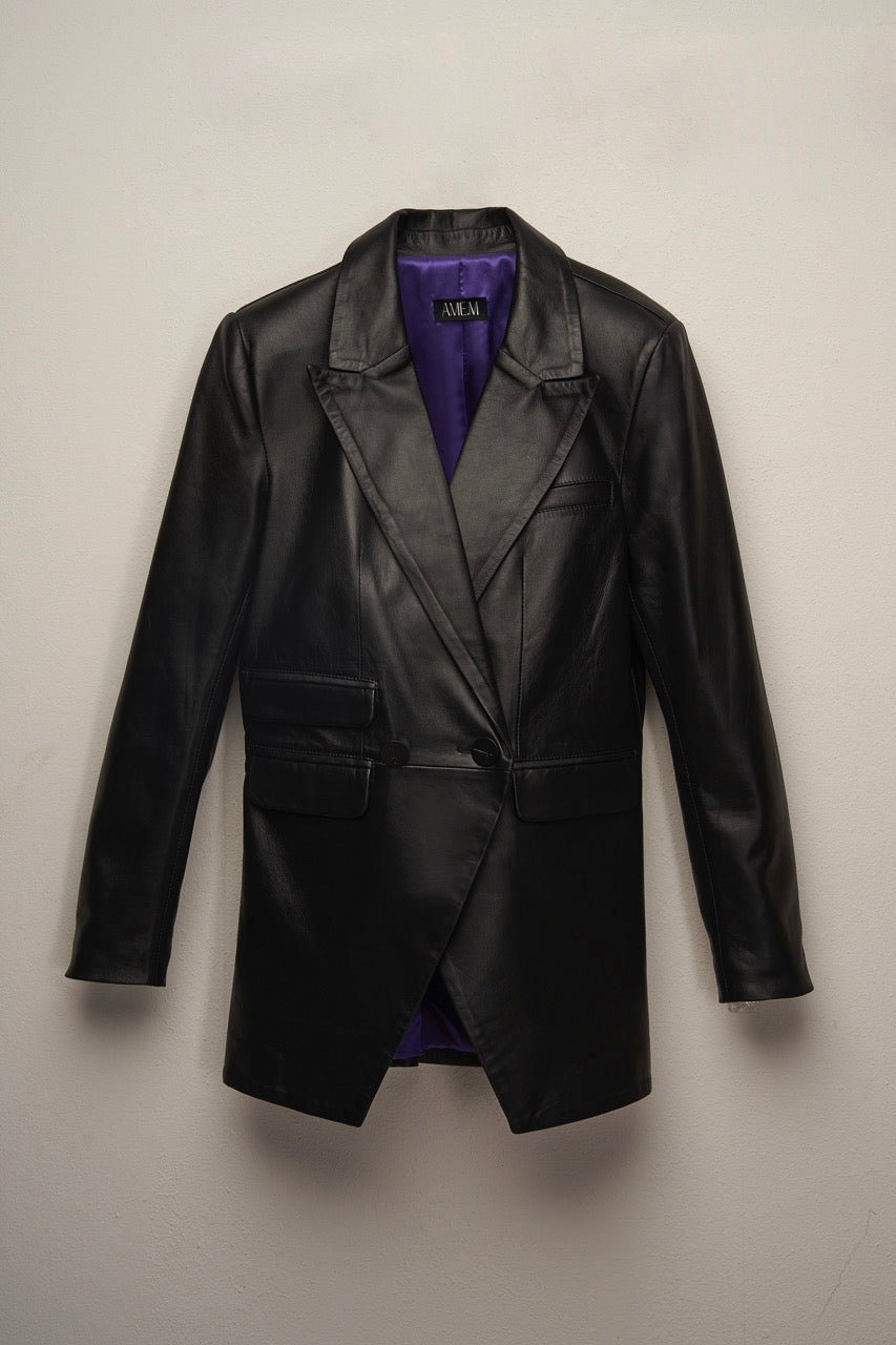 Blazer clássico da AME.M, foi confeccionado em couro legitimo e forro nobre 100% acetato, com ombreiras leves, fechamento transpassado e design único. Conta também com botões fabricados em zamak na cor preto fosco. Botões personalizados exclusivamente para a AME.M.Os forros das peças AME.M foram desenvolvidos na cor PURPURA. Leia a interessante história da cor PURPURA aqui.A AME.M busca reduzir o impacto social e ambiental através de suas operações, realizadas de maneira ética e sustentável, respeitando o meio ambiente e adotando práticas responsáveis ao longo da cadeia de fornecimento de couro e outros suprimentos.